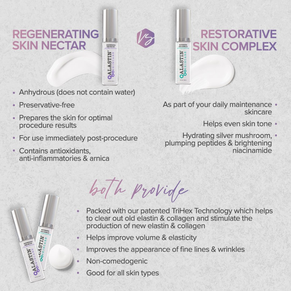 - Transition to Restorative Skin Complex once your skin has healed and Regenerating Skin Nectar bottle is finished. Apply 1-2 pumps each morning and evening to desired area. Avoid getting in eyes.
