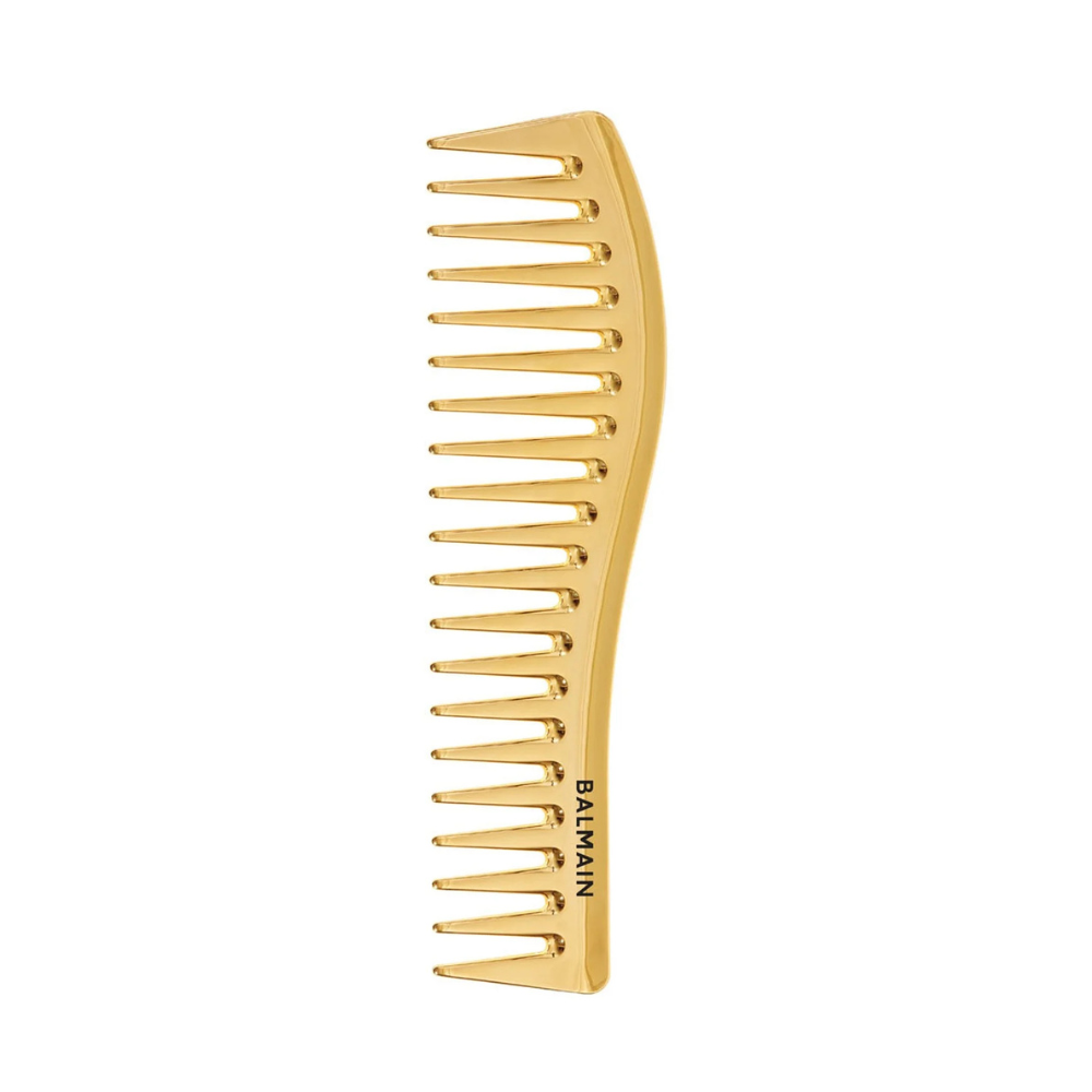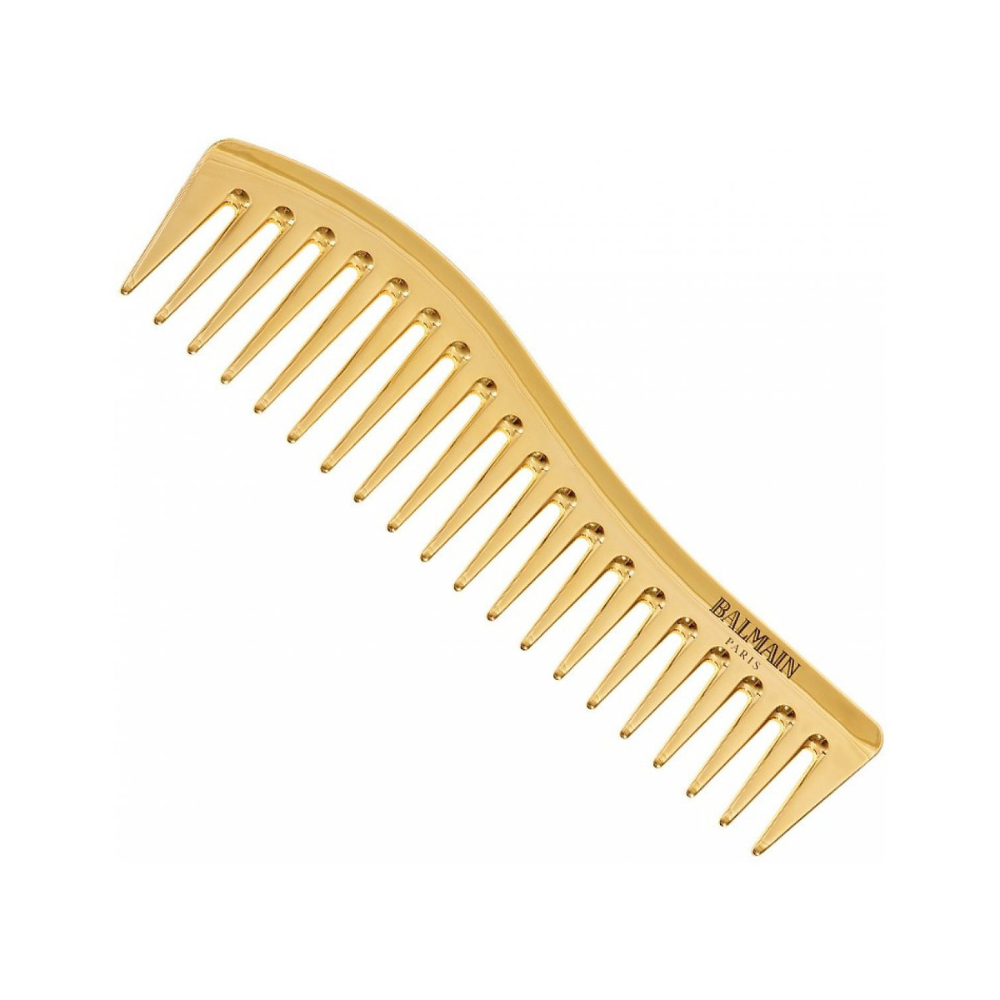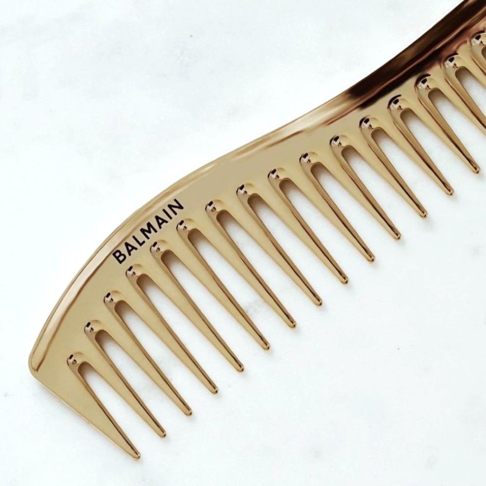 The Balmain Golden Styling Comb is a distinguished piece from the exclusive Golden Comb Collection by Balmain Paris Hair Couture. This premium styling tool is crafted with authentic 14K gold-plating, merging opulence with functionality. The professional-grade comb features wide teeth specifically designed to glide effortlessly through hair, minimising breakage and preventing damage.