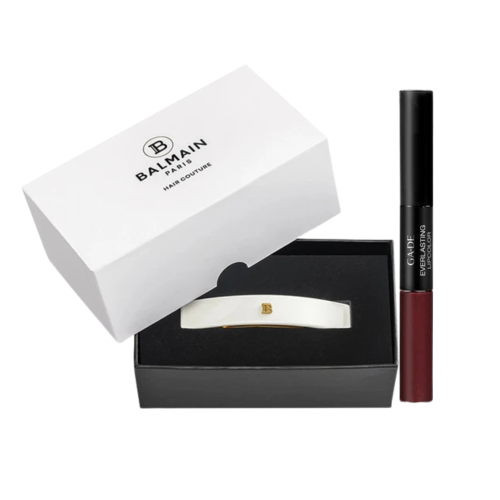 Embrace timeless French sophistication with this exclusive Beauty Affairs bundle pairing the exquisite Balmain Hair Barrette Medium with a complimentary GA-DE Everlasting Lip Color. This meticulously handcrafted barrette represents the pinnacle of hair accessory design, featuring an authentic French clip mechanism and Balmain's coveted 14K gold-plated "B" emblem.