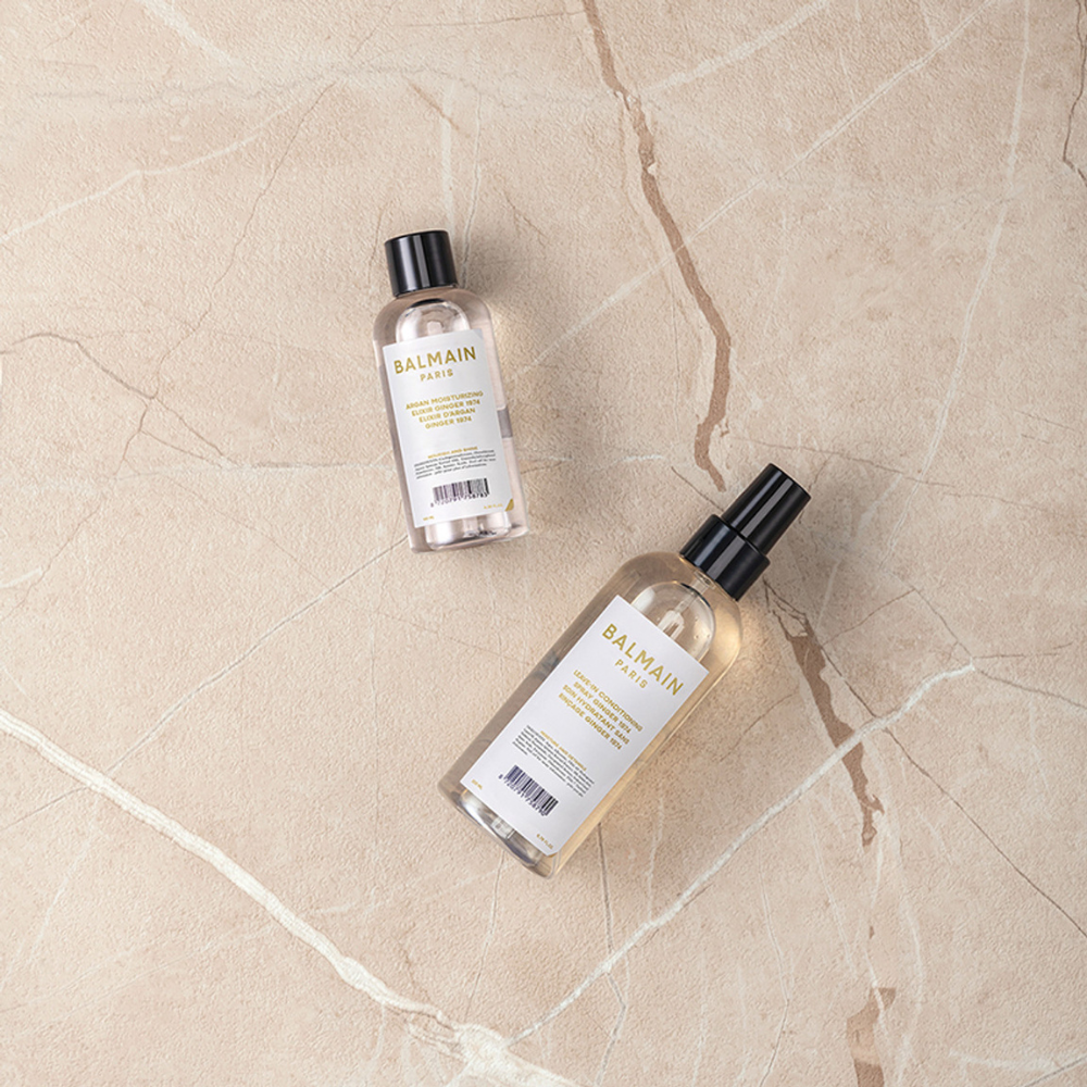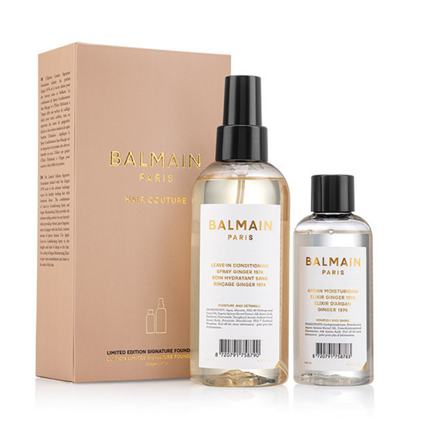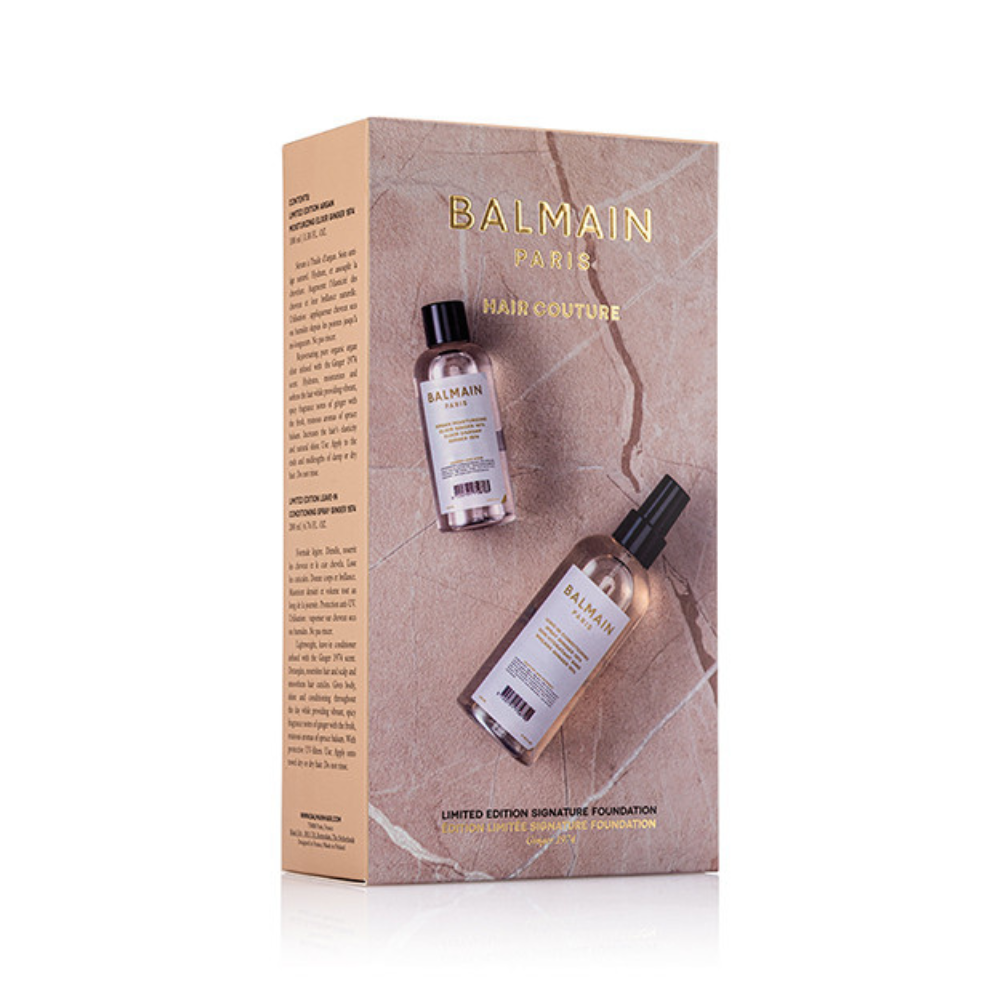 The Balmain Limited Edition Signature Foundation Ginger is a luxurious two-step foundation for hair, featuring the Argan Moisturizing Elixir and the Leave-in Conditioning Spray. Working together, they create the perfect base for all hair types, delivering essential nourishment, smooth detangling, and protection from external stressors. Hair is left feeling soft, glossy, and manageable.