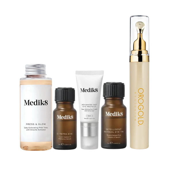 Revitalise and restore your eye area with the Collagen Restore Set, a luxurious combination of targeted treatments designed to combat signs of ageing and fatigue. This comprehensive set pairs the clinically-proven Medik8 CSA Eye Kit with the indulgent Orogold Exclusive Eye Collection 24K 60-Second Eye Solution for complete eye rejuvenation.