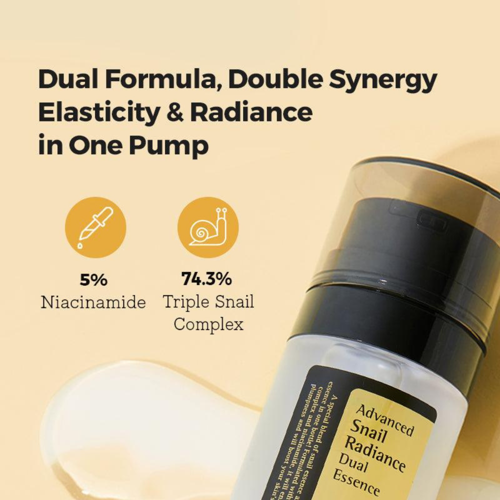 Dive into the dual-power of COSRX Advanced Snail Radiance Dual Essence, a revolutionary 2-in-1 formula designed to enhance skin elasticity and radiance with every use.