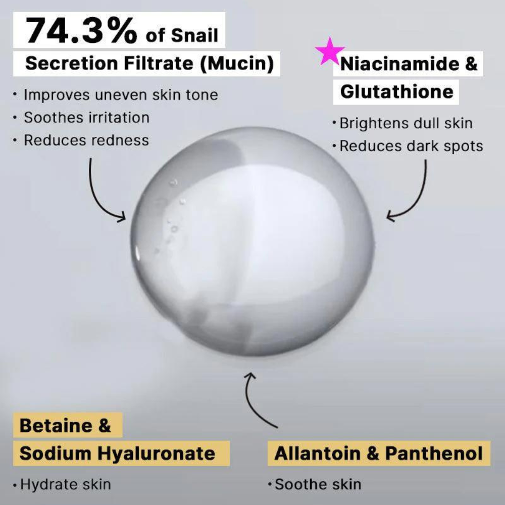 Snail Secretion Filtrate, Butylene Glycol, Niacinamide, 1,2-Hexanediol, Betaine, Panthenol, Water, Glycerin, Limnanthes Alba (Meadowfoam) Seed Oil, Helianthus Annuus (Sunflower) Seed Oil, Allantoin, Carbomer, Macadamia Ternifolia Seed Oil, Sodium Polyacrylate, Sodium Hyaluronate, Inulin Lauryl Carbamate, Arginine, Argania Spinosa Kernel Oil, Xanthan Gum, Sodium Surfactin, Ethylhexylglycerin, Glutathione.