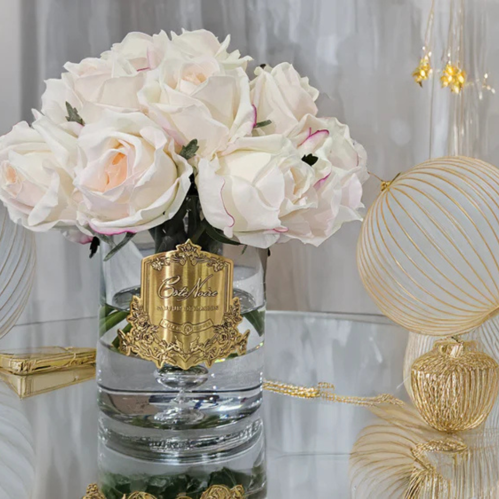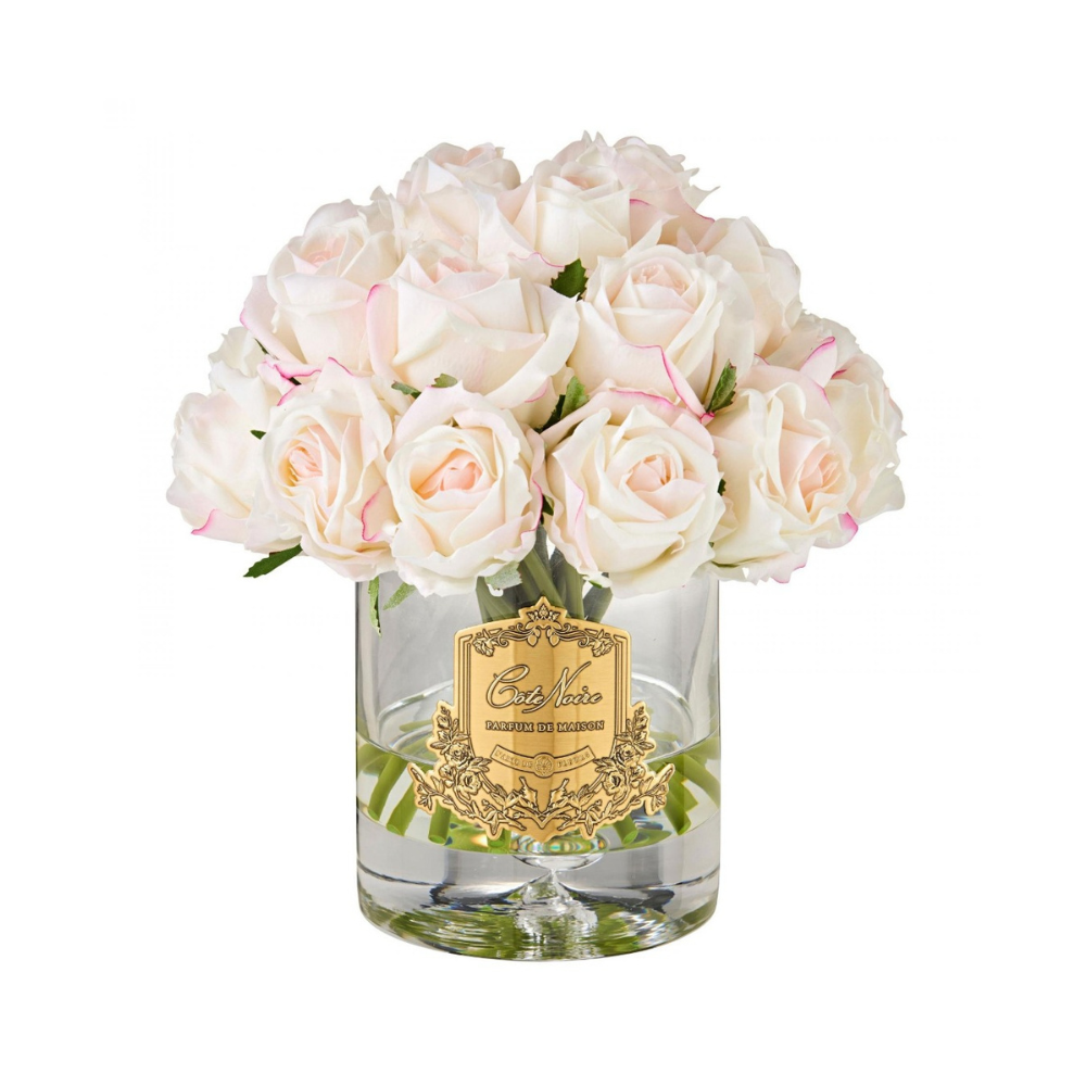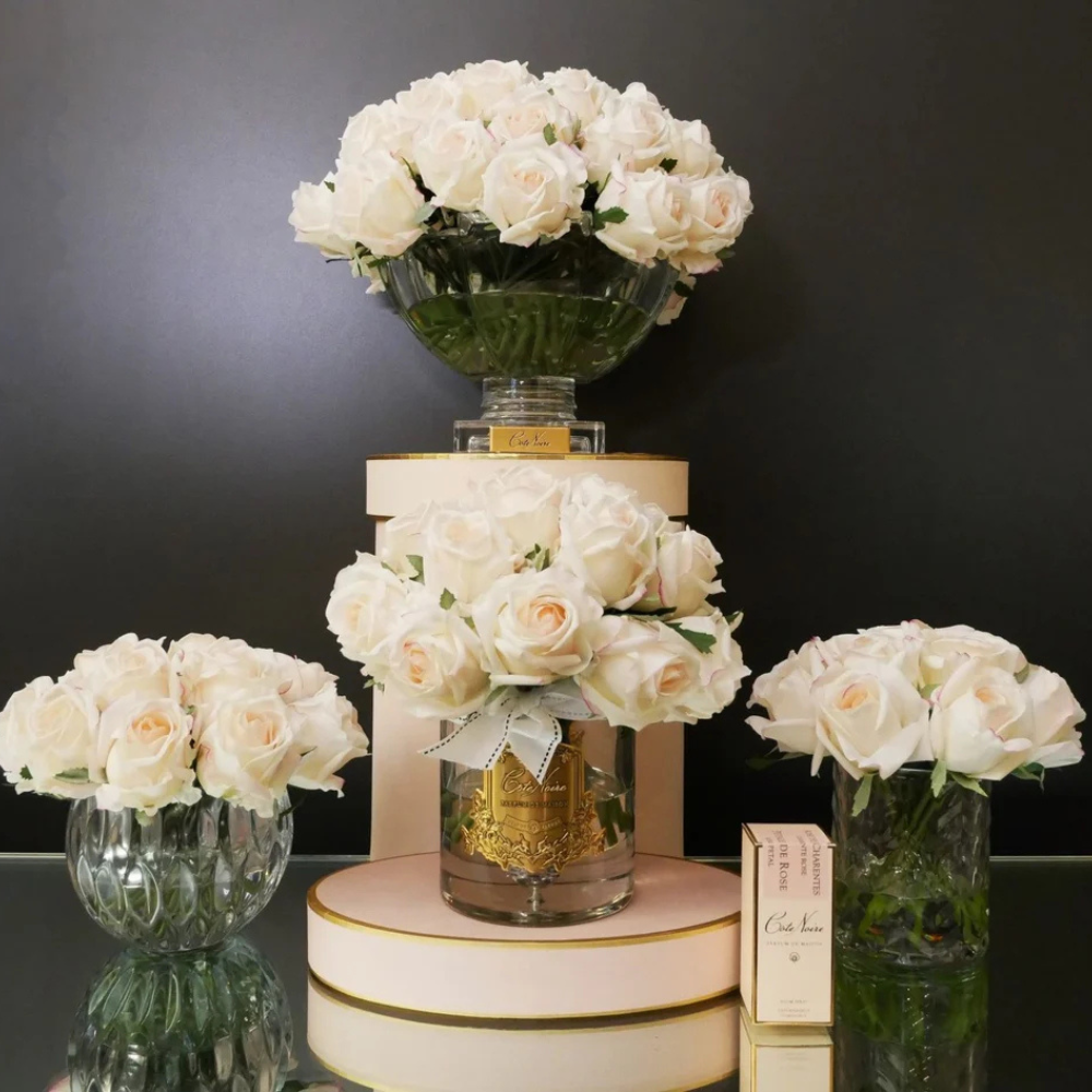 The Luxury Grand Rose Bud Bouquet in Pink Blush from Cote Noire features twenty-one life-like rose buds, each skilfully handcrafted with a natural coating for an authentic touch and appearance. Set in a hand-blown glass vessel with the signature gold Cote Noire badge, the roses are beautifully arranged in gel that creates the illusion of water.