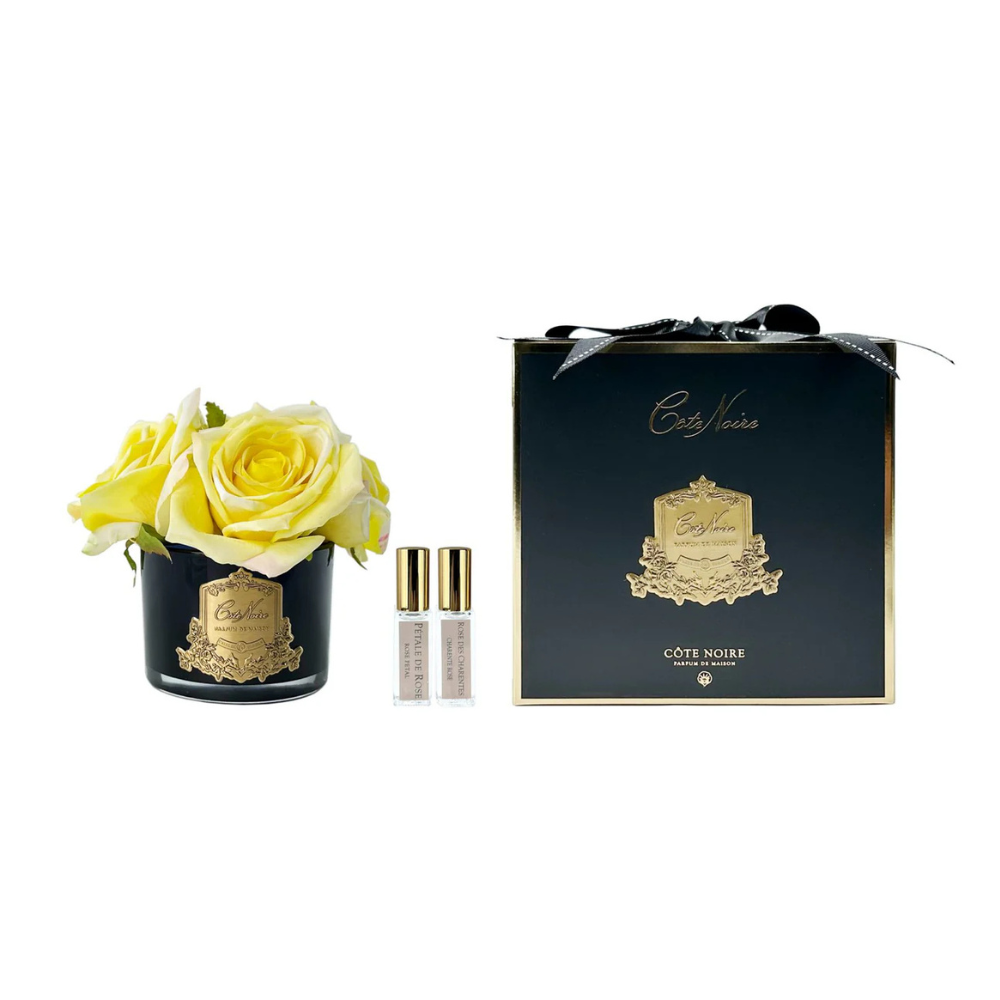 The vibrant carmine red of these roses adds a bold touch of colour, embodying passion and sophistication in every petal. Designed to look and feel like real roses, this arrangement captures the essence of natural beauty while delivering a luxurious scent that lingers. Ideal for creating a focal point in any room, the Cote Noire Yellow. roses are a testament to refined taste, perfect for those who appreciate the finer things in life.