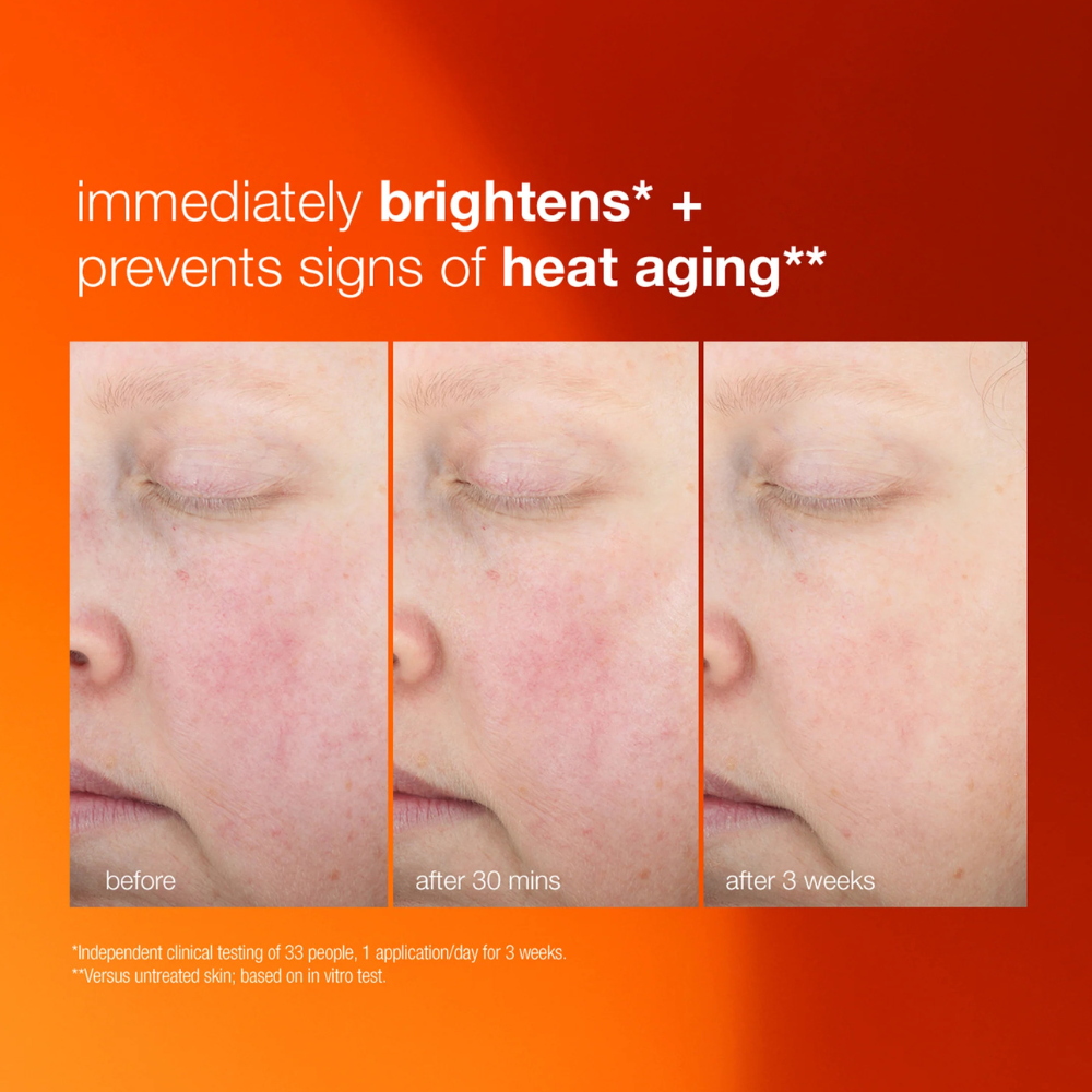 Infused with ultra-stable Vitamin C, this lightweight moisturiser immediately brightens, hydrates, and soothes the skin while fighting harmful free radicals. The advanced Thermaradiance Complex works in tandem with Vitamin E to defend against visible signs of heat ageing, helping to improve skin texture and tone for a more radiant complexion.