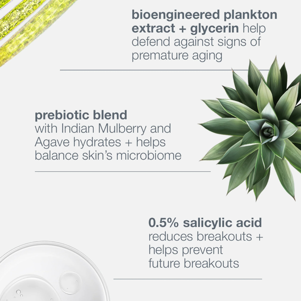 Bioengineered Plankton Extract and Glycerin work together to hydrate skin's barrier, plus a prebiotic blend with Indian Mulberry, Glutamic Acid, and Agave-derived Inulin helps balance your skin's microbiome. Salicylic Acid reduces breakouts by exfoliating away dead skin cells, helping to keep pores clear and prevent future breakouts, while Niacinamide and Jojoba strengthen the skin barrier to reduce the look of pores and post-blemish marks.