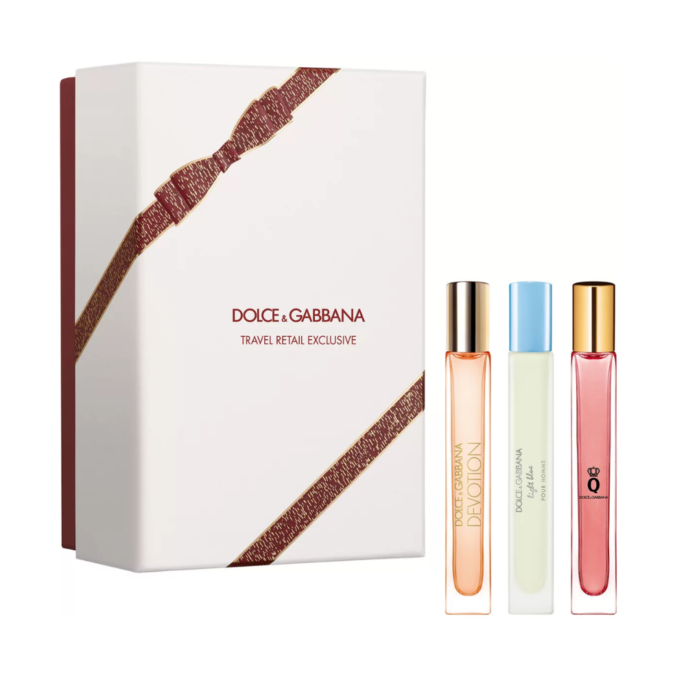 A set of three popular fragrances in travel sizes in an ivory box, "Divotion", which sublimates the purest emotions into a unique essence, "Light Blue", which expresses the rich days spent in the sun on Capri, and "Q by Dolce", which is inspired by passion, love, and energy & Gabbana".