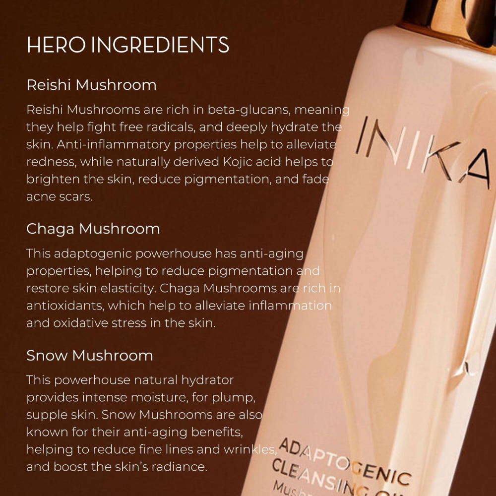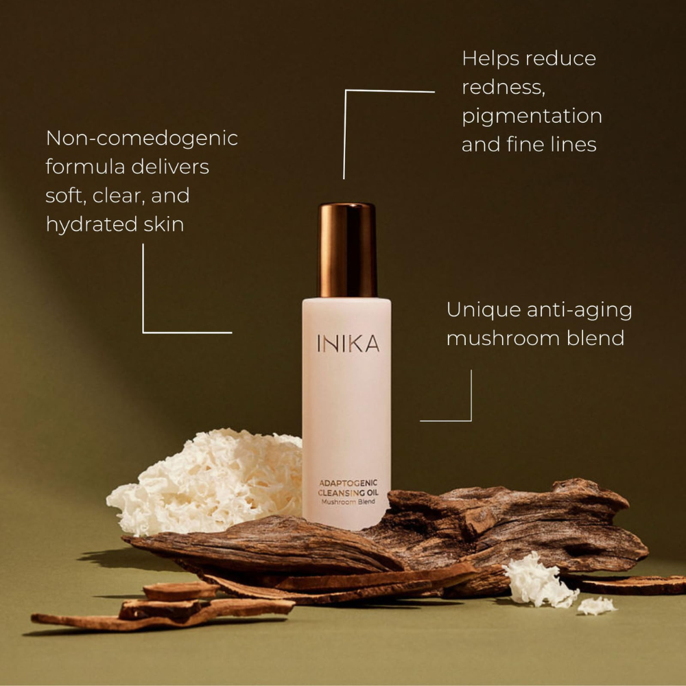 INIKA Adaptogenic Cleansing Oil is an ultra-luxe makeup melting cleanser that effortlessly dissolves and draws out impurities, stubborn makeup, and pollutants while leaving skin perfectly balanced and hydrated. The unique anti-ageing mushroom blend contains powerful antioxidants that help reduce redness, pigmentation, and fine lines while protecting skin from harmful free radicals.