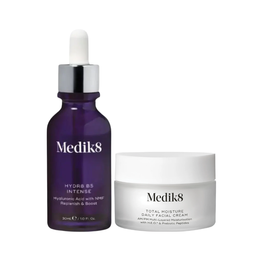 Medik8 Hydr8 B5 Intense serum delivers deep hydration with hyaluronic acid and vitamin B5, while Medik8 Total Moisture Daily Facial Cream provides 100 hours of moisturisation and improves skin barrier function by 30%.