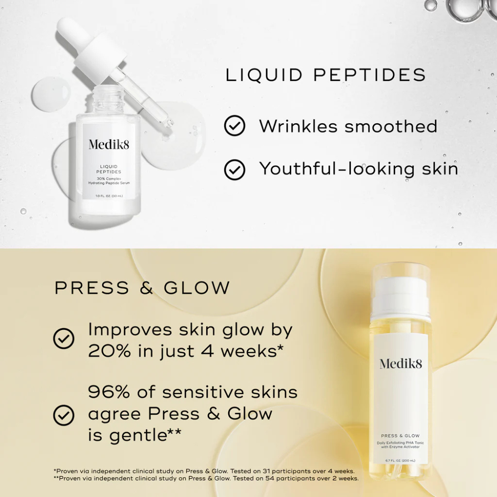 SkiTransform your skincare routine with the Medik8 Luminous Lift Gift Pack. This powerful duo combines Press & Glow, a gentle exfoliating toner that removes dead surface cells, with Liquid Peptides, an advanced anti-ageing serum.
