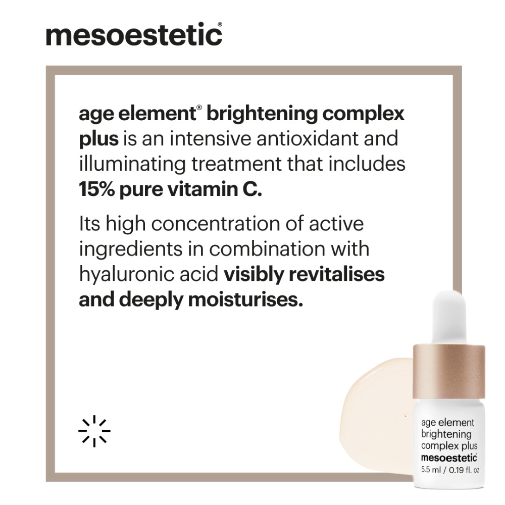 Mesoestetic Age Element Brightening Complex Plus is an intensive shock treatment that combines powerful brightening and anti-aging benefits. At its core is a stabilised 15% Vitamin C complex, expertly encapsulated to maintain maximum potency until the moment of use.