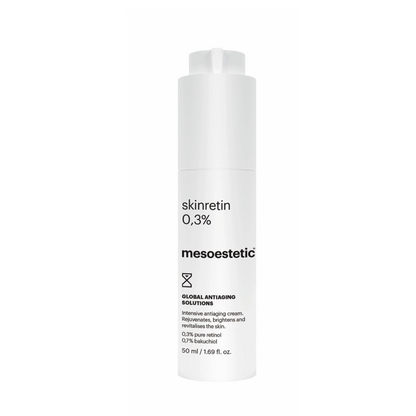 Mesoestetic Global Anti-Ageing Solutions Skinretin 0.3% is an advanced night cream that harnesses the powerful combination of pure retinol and bakuchiol to deliver comprehensive anti-ageing benefits. This innovative formula works intensively to regenerate and renew the skin, effectively tackling multiple signs of ageing including deep wrinkles, expression lines, uneven tone, and loss of elasticity.