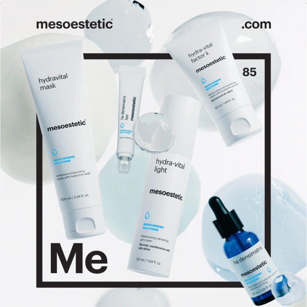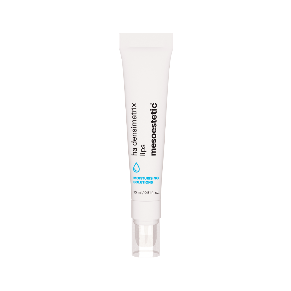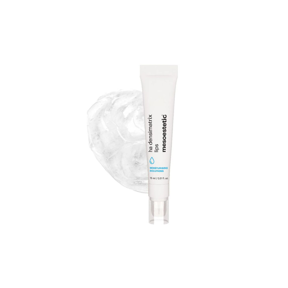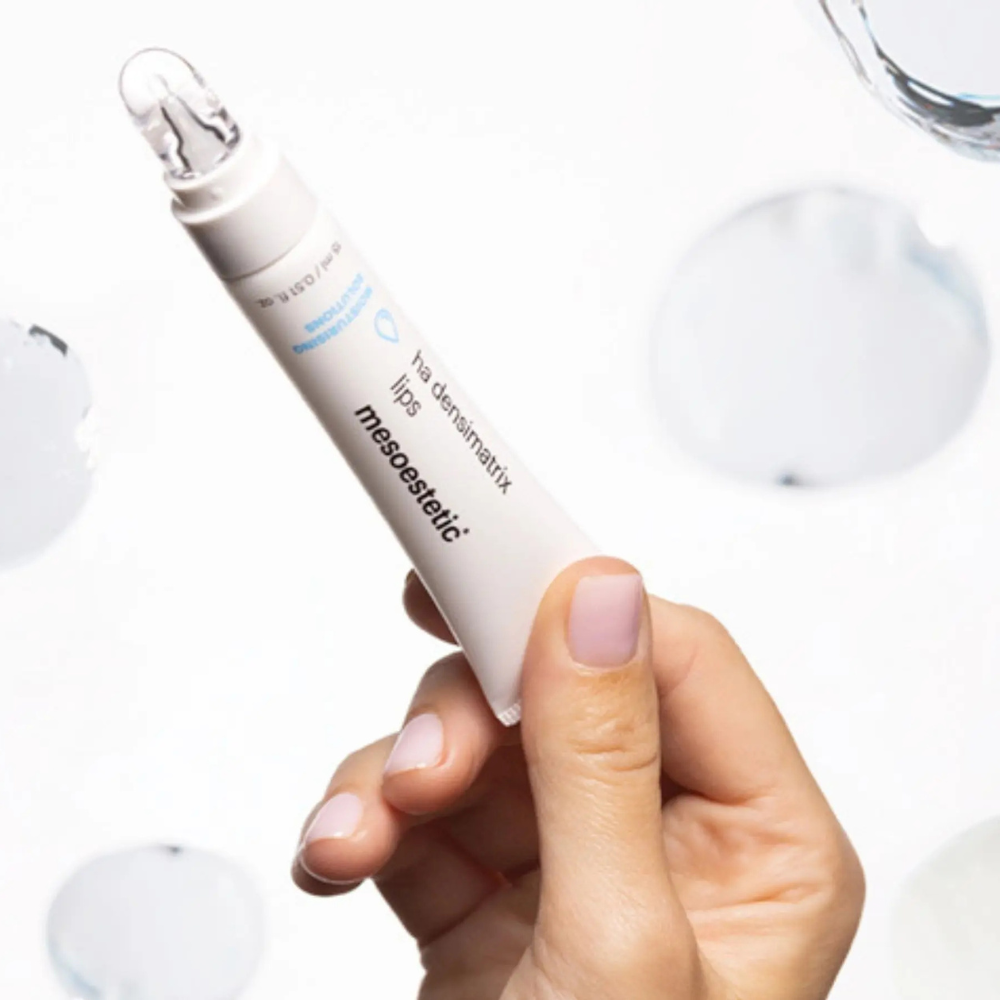 Mesoestetic Moisturising Ha Denmatrix Lips restores softness and hydration with hyaluronic acid and botanical extracts, ideal for post-procedure lip care.
