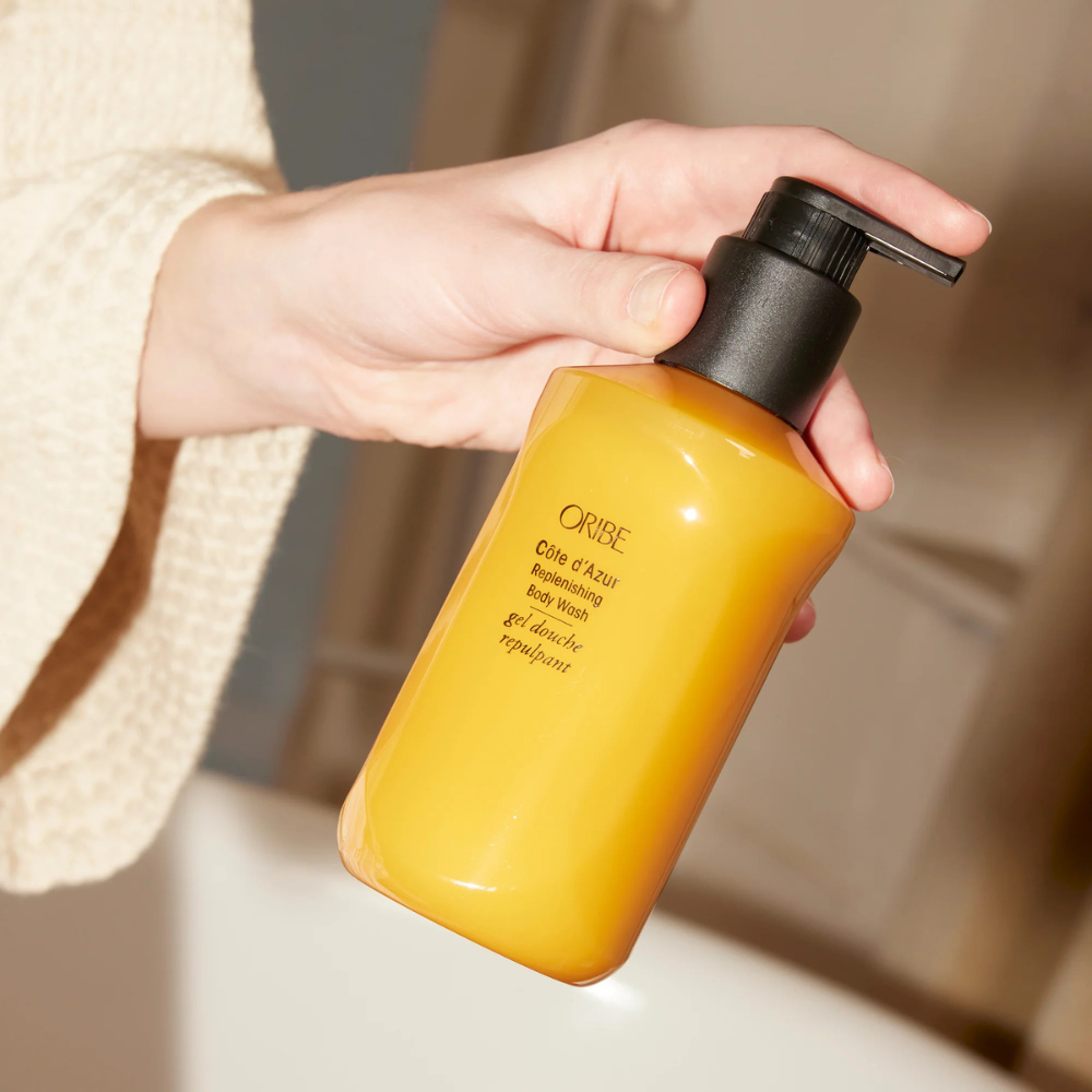 - Apply a generous amount of Oribe Côte d'Azur Replenishing Body Wash to damp skin or a wet washcloth.