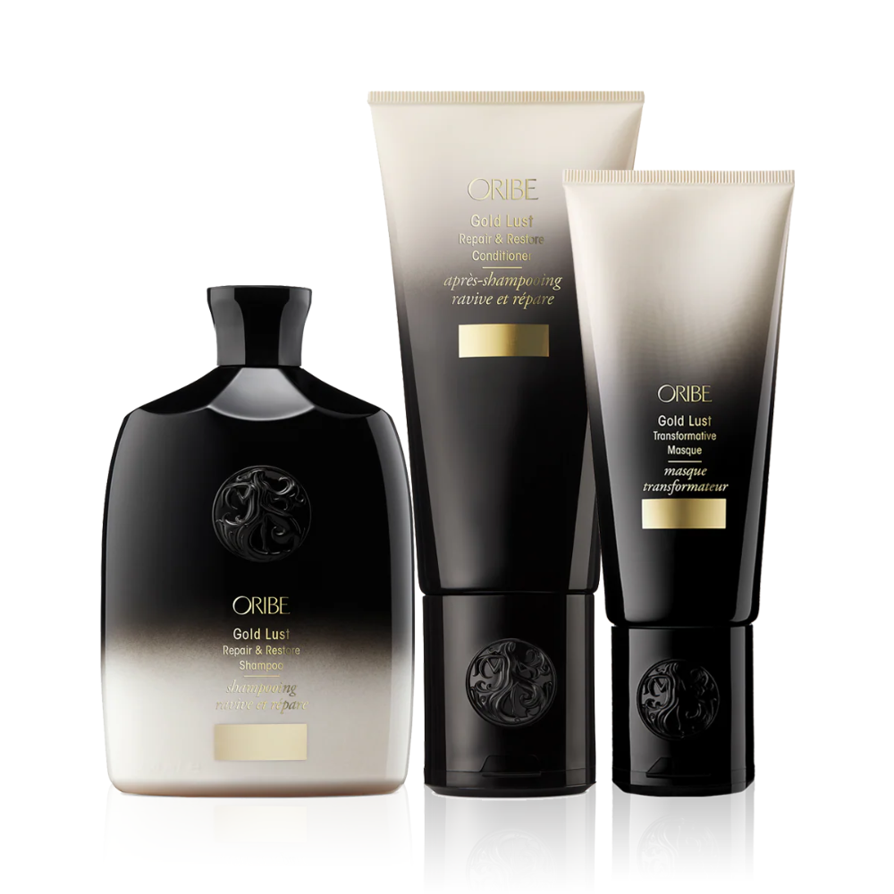 - After shampooing, apply Oribe Gold Lust Transformative Masque generously from mid-lengths to ends on damp hair.