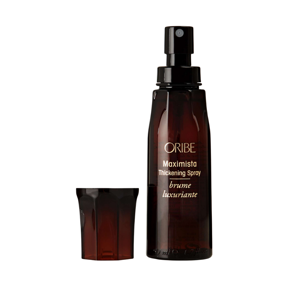 - Spray Oribe Maximista Thickening Spray on damp hair, section by section, from roots to ends.