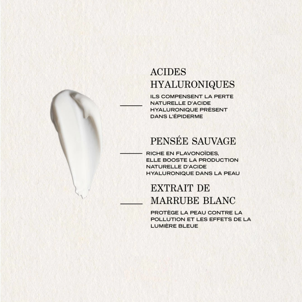 Aqua (Water), Glycerin, Dicaprylyl Carbonate, Butyrospermum Parkii (Shea) Butter, Cetearyl Isononanoate, Sucrose Distearate, Butylene Glycol, Maltodextrin, Sodium Polyacrylate, Albizia Julibrissin Bark Extract, Marrubium Vulgare Extract, Hydrolyzed Viola Tricolor Extract, Pinus Cembra Wood Extract, Sigesbeckia Orientalis Extract, Sodium Hyaluronate, Cetyl Alcohol, Pentaerythrityl Distearate, Undecane, Benzyl Alcohol, Sodium Stearoyl Glutamate, Tridecane, Chlorphenesin, O-Cymen-5-Ol, Citric Acid, 1,2-Hexanediol, Caprylyl Glycol, Sodium Chloride, Sodium Benzoate, Tocopherol